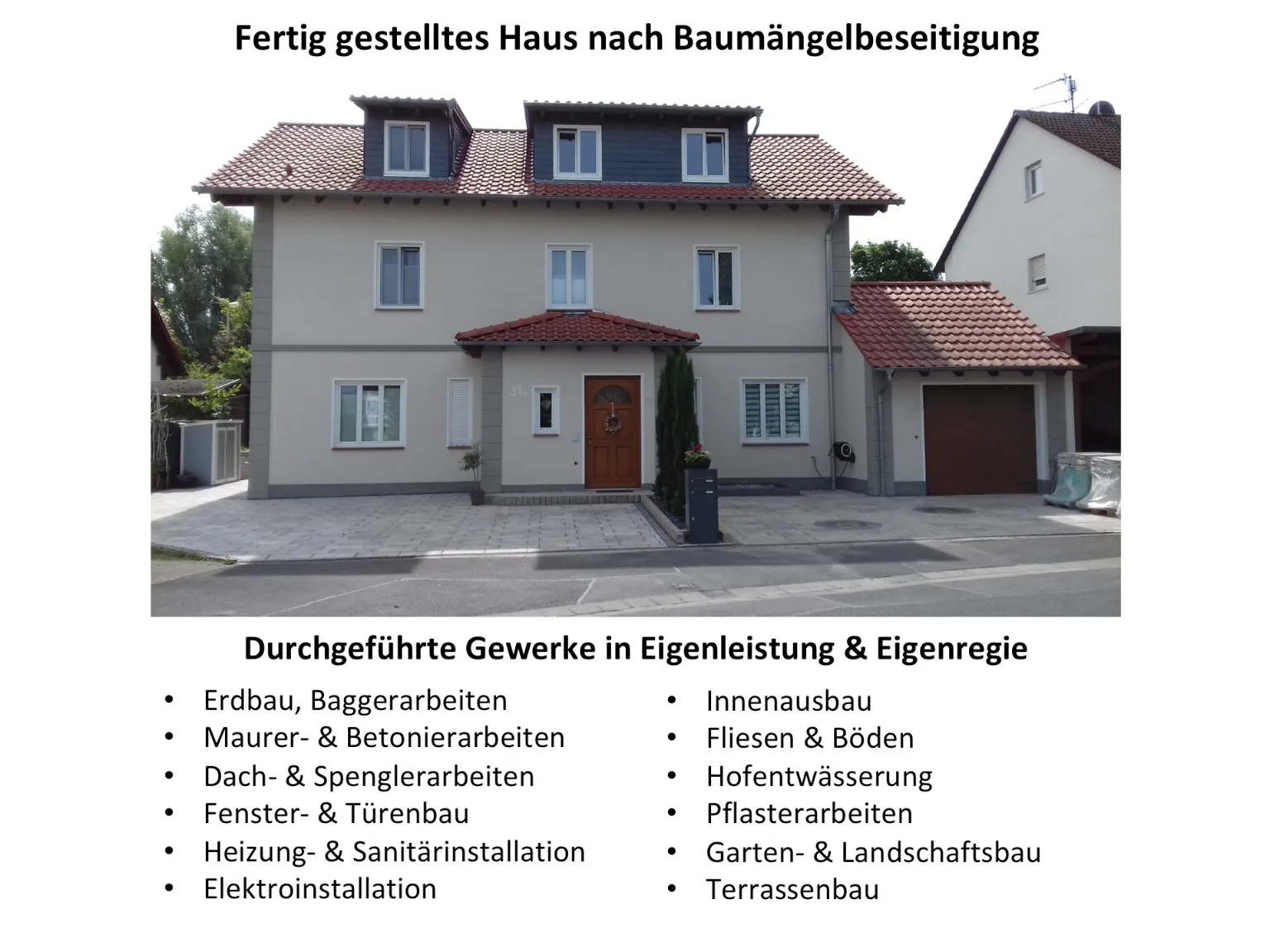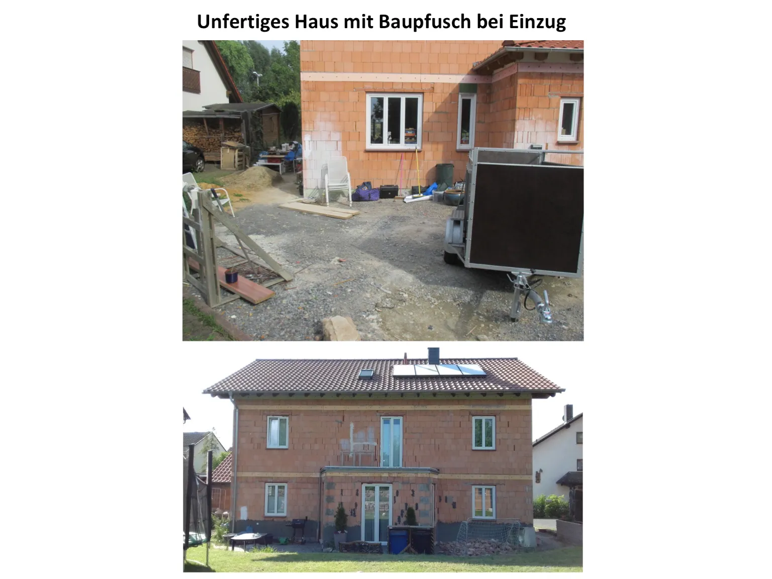 Bei meinem eigenen Bauvorhaben Ende 2013 hatte ich mich nicht ausreichend auf das Thema "Hausbau" vorbereitet (wie die meisten Bauherren wahrscheinlich), sondern diesen mehr oder weniger "blind" den Fachleuten überlassen, frei nach dem Motto "Sie wissen schon, was sie tun!" Was dabei herauskam war leider ein nicht fertig gestelltes Haus und eine Menge Baupfusch und Ärger in den Hauptgewerken Erdbau, Maurer- & Betonierarbeiten, Fensterbau, Dach- & Spenglerarbeiten sowie Heizung- & Sanitärinstallation. Dies hatte ich natürlich bei der Verwirklichung meines "Traums vom Eigenheim", weder in finanzieller noch handwerklicher Hinsicht, eingeplant. Ein kurzfristiger Verkauf des unfertigen, fehlerhaften Hauses und das dauerhafte Leben darin als Familie, mit damals 2 kleinen Kindern (6 Monate & 2 Jahre), waren undenkbar. Bis auf einen Heizungsbauer, war von den verschiedenen angefragten Handwerksbetrieben keiner bereit, sich in den Baupfusch der anderen Handwerker zu setzen und das Haus fertig zu stellen. Deshalb musste ich nun selbst etwas an der fatalen Bausituation ändern und "den Karren aus dem Dreck ziehen". Ich arbeitete mich in alle Baugewerke ein, eignete mir Wissen, Können und praktische Fähigkeiten an, um Problemlösungen zu erarbeiten und in Eigenregie umzusetzen. Teils mit Unterstützung ausgewählter, zuverlässiger Handwerker und Handwerksbetriebe, konnte ich den Pfusch beseitigen und das Haus fertig stellen.